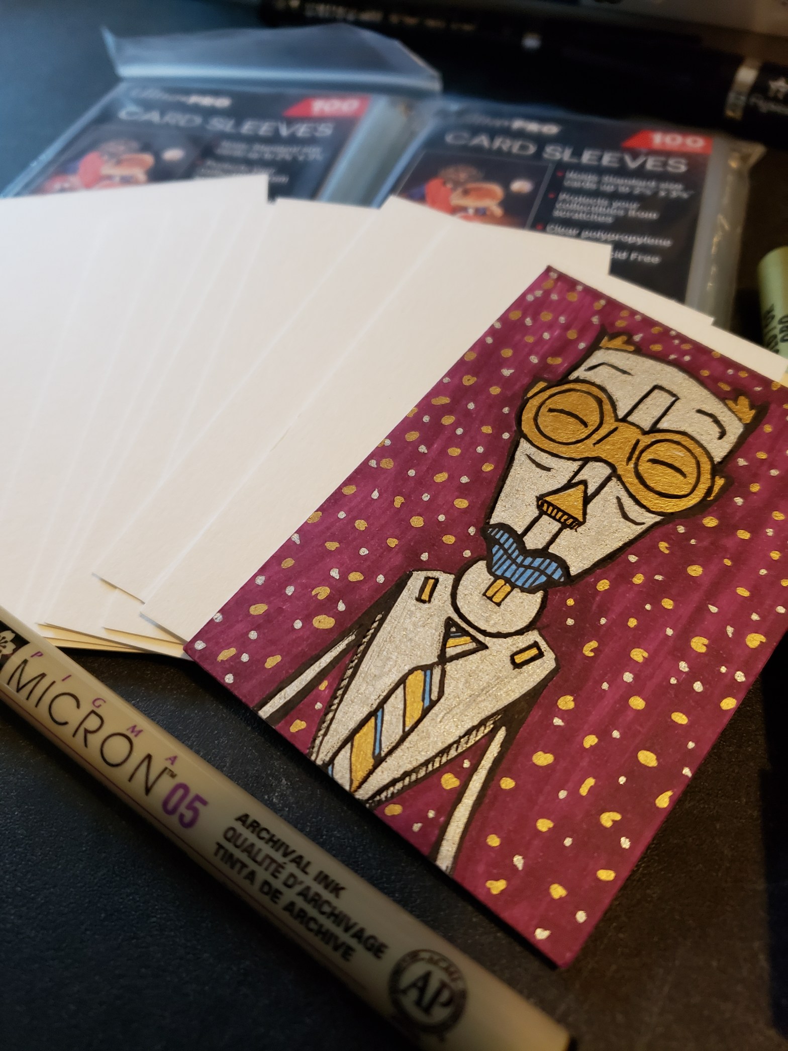 The only solid rule to ACEOs, or “Art Cards, Editions and Originals” is that it needs to be a certain size: 2.5 by 3.5 inches (64 mm × 89 mm). You’re really only limited by your imagination in terms of what to use to create the card. Not only what you put on the card (paint, markers, pen, pencil, mixed media, etc), but what kind of material you use to make the card itself. You’ll typically want thicker paper such as 140 lb watercolor paper for example. If you use typical computer paper you’re going to end up with a flimsy card that doesn’t hold up so well to paint or heavy use of markers. If you’ll be making the cards yourself I highly recommend using a paper trimmer instead of attempting to use scissors, just so you can make sure you have straight lines.